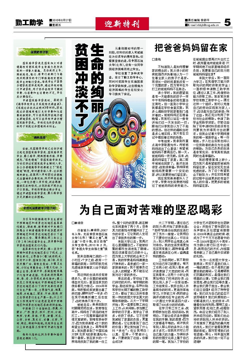 现在我和弟弟都升入了大学,学费与生活费绝对超过了爸爸妈妈的承受能力。在爸爸提出想再次外出打工时,我郑重地向爸爸承诺:大学期间绝不给家里增添经济负担,我要靠自己的努力把爸爸妈妈留在家!