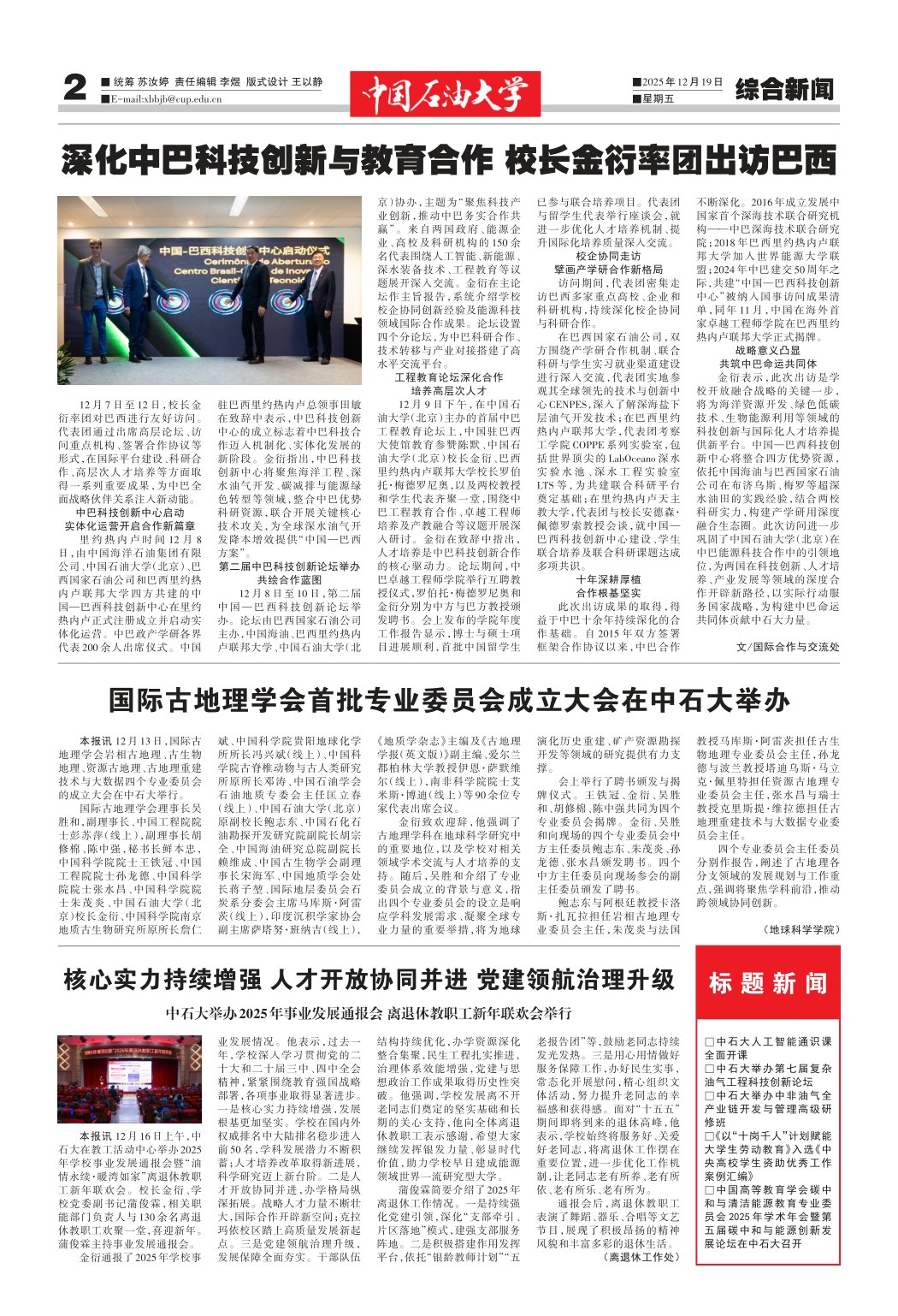 金衍通报了 2025 年学校事业发展情况。他表示,过去一年,学校深入学习贯彻党的二十大和二十届三中、四中全会精神,紧紧围绕教育强国战略部署,各项事业取得显著进步。一是核心实力持续增强,发展根基更加坚实。学校在国内外权威排名中大陆排名稳步进入前 50 名,学科发展潜力不断积蓄;人才培养改革取得新进展,科学研究迈上新台阶。二是人才开放协同并进,办学格局纵深拓展。战略人才力量不断壮大,国际合作开辟新空间;克拉玛依校区踏上高质量发展新起点。三是党建领航治理升级,发展保障全面夯实。干部队伍结构持续优化,办学资源深化整合集聚,民生工程扎实推进,治理体系效能增强,党建与思想政治工作成果取得历史性突破。他强调,学校发展离不开老同志们奠定的坚实基础和长期的关心支持,他向全体离退休教职工表示感谢,希望大家继续发挥银发力量、彰显时代价值,助力学校早日建成能源领域世界一流研究型大学。