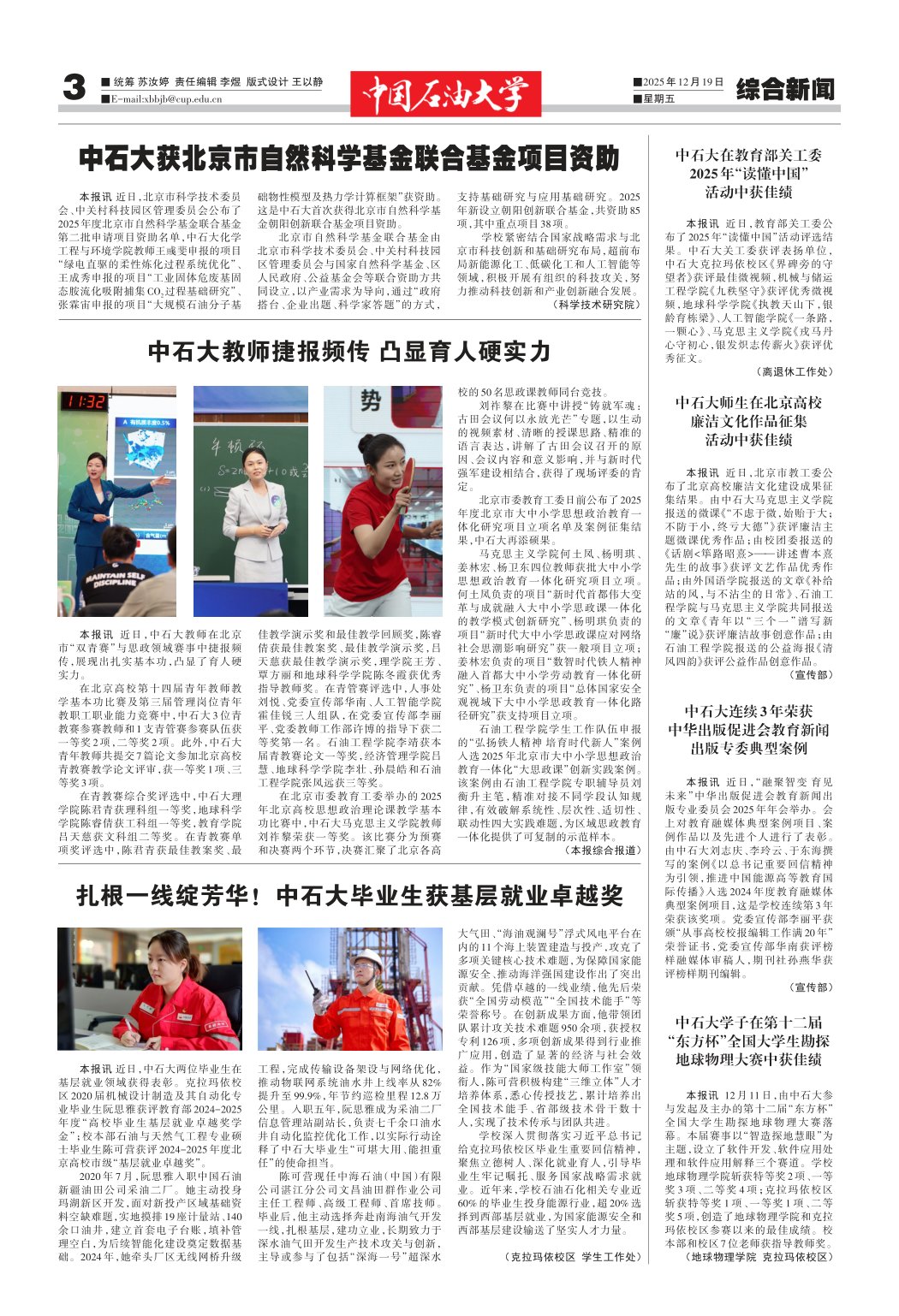 本报讯 近日,北京市科学技术委员会、中关村科技园区管理委员会公布了2025年度北京市自然科学基金联合基金第二批申请项目资助名单,中石大化学工程与环境学院教师王彧斐申报的项目“绿电直驱的柔性炼化过程系统优化”、王成秀申报的项目“工业固体危废基固态胺流化吸附捕集 CO2过程基础研究”、张霖宙申报的项目“大规模石油分子基础物性模型及热力学计算框架”获资助。这是中石大首次获得北京市自然科学基金朝阳创新联合基金项目资助。