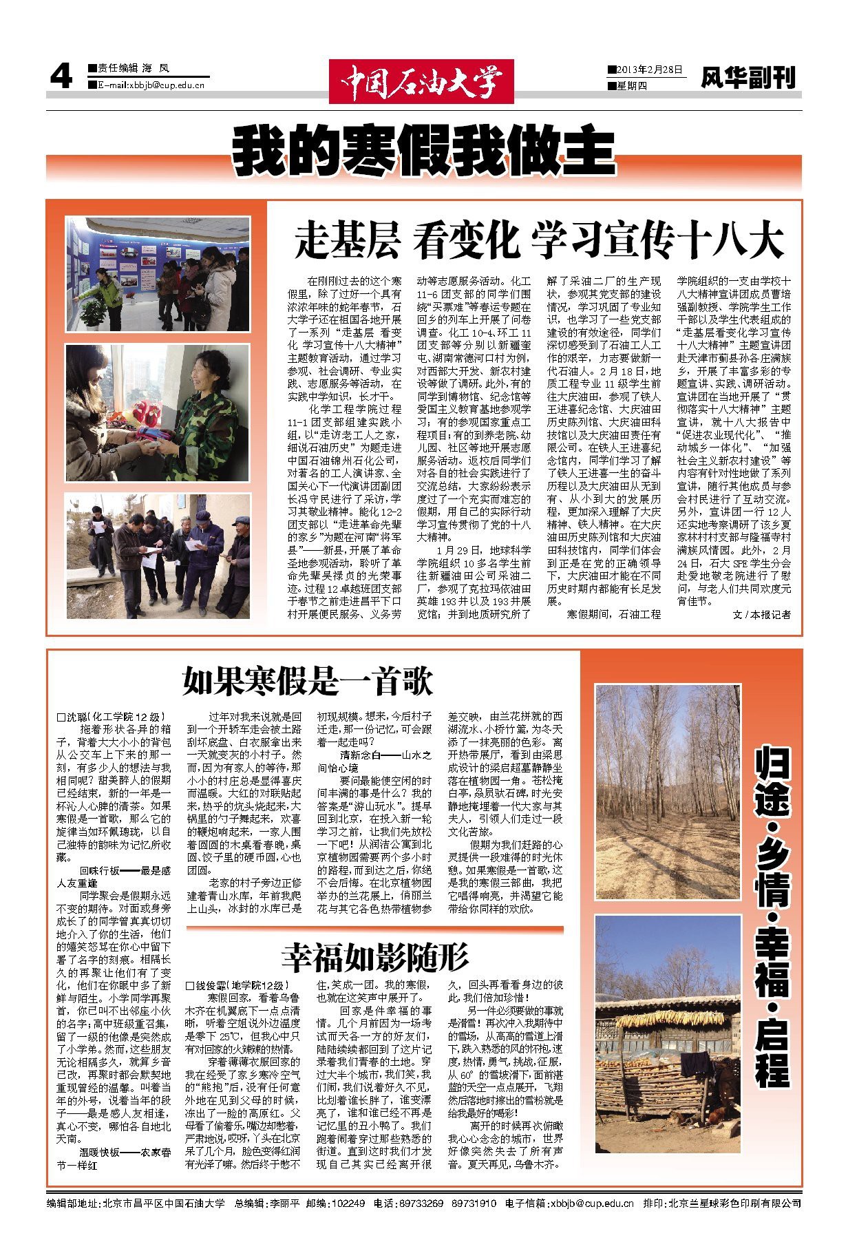 在刚刚过去的这个寒假里,除了过好一个具有浓浓年味的蛇年春节,石大学子还在祖国各地开展了一系列“走基层看变化学习宣传十八大精神”主题教育活动,通过学习参观、社会调研、专业实践、志愿服务等活动,在实践中学知识,长才干。