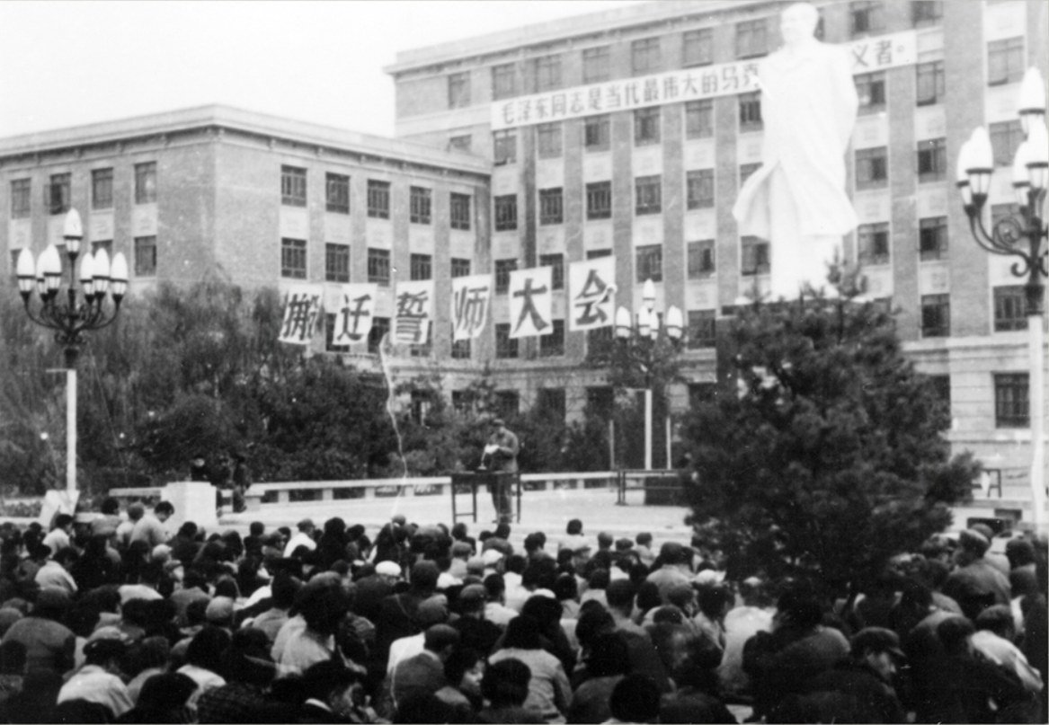 北京石油学院在祖国的首都发展了十六年后,按照石油部军管会迁校命令,1969 年 10 月下旬至 11 月上旬迁至山东省东营地区。1970 年 1 月,北京石油学院改名为华东石油学院。在黄河入海口的盐碱荒滩上,全校师生员工坚守石油高等教育使命,开始了又一次建校创业。起初,学校没有校门,自然也没有校牌。后来有了校门,校牌上是以仿宋体写的“华东石油学院革命委员会”字样。再后来又用毛泽东书体描上校名,把“北京”改成了“华东”。