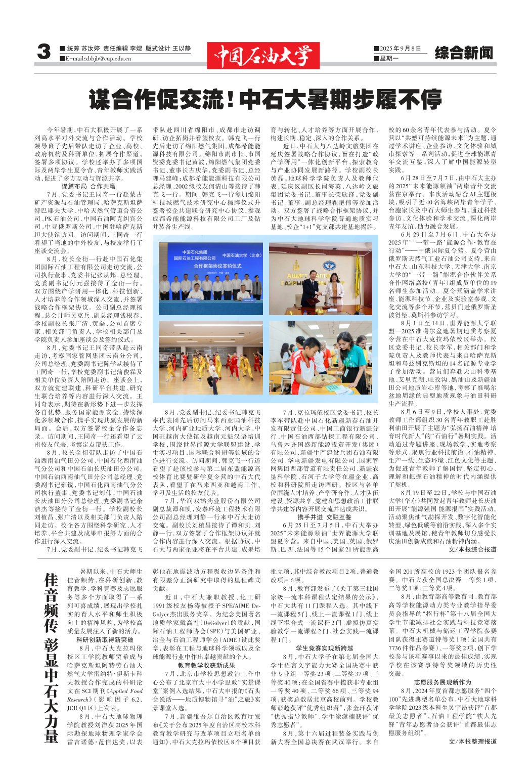 今年暑期,中石大积极开展了一系列高水平对外交流与合作活动。学校领导班子先后带队走访了企业、高校、政府机构及科研单位,拓展合作渠道,签署多项协议。学校还举办了多项国际及两岸学生夏令营、青年教师实践活动,促进了多方互动与资源共享。