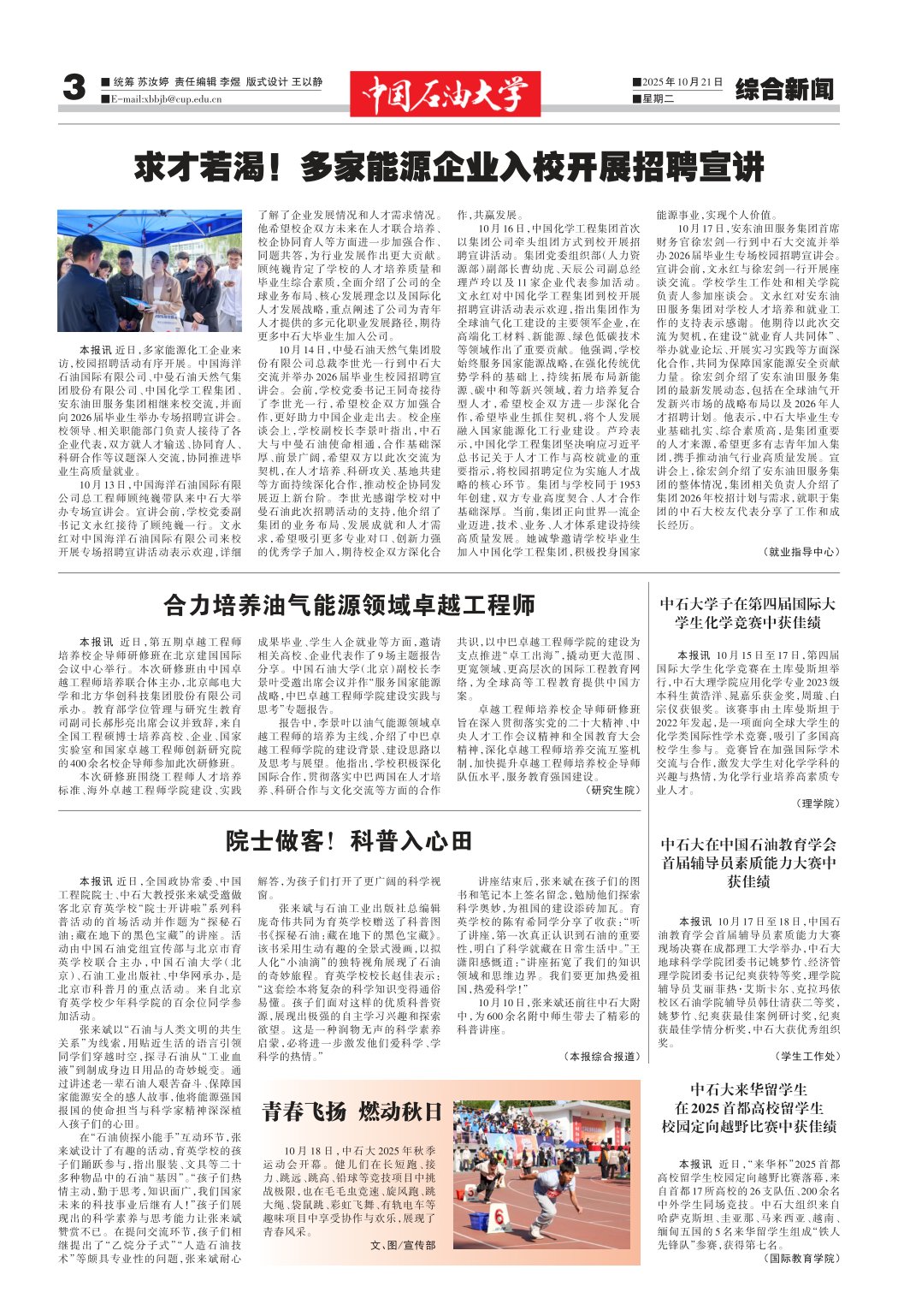 本报讯 近日,多家能源化工企业来访,校园招聘活动有序开展。中国海洋石油国际有限公司、中曼石油天然气集团股份有限公司、中国化学工程集团、安东油田服务集团相继来校交流,并面向2026届毕业生举办专场招聘宣讲会。校领导、相关职能部门负责人接待了各企业代表,双方就人才输送、协同育人、科研合作等议题深入交流,协同推进毕业生高质量就业。