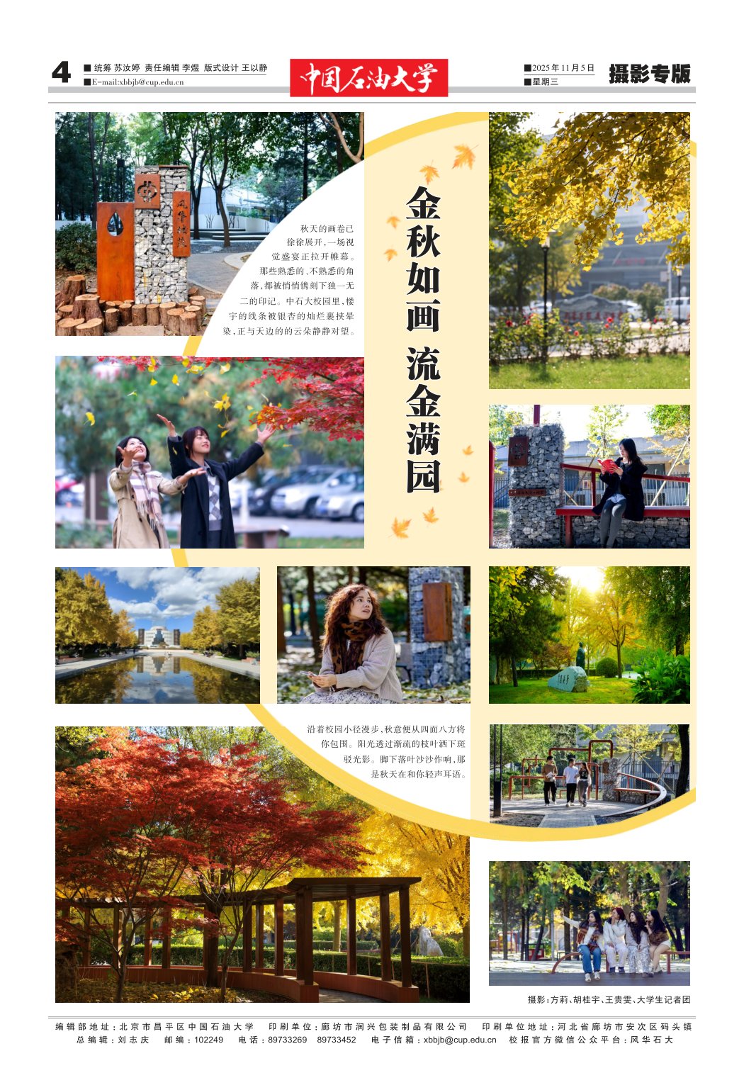 秋天的画卷已徐徐展开,一场视觉盛宴正拉开帷幕。那些熟悉的、不熟悉的角落,都被悄悄镌刻下独一无二的印记。中石大校园里,楼宇的线条被银杏的灿烂裹挟晕染,正与天边的云朵静静对望。沿着校园小径漫步,秋意便从四面八方将你包围。阳光透过渐疏的枝叶洒下斑驳光影。脚下落叶沙沙作响,那是秋天在和你轻声耳语。