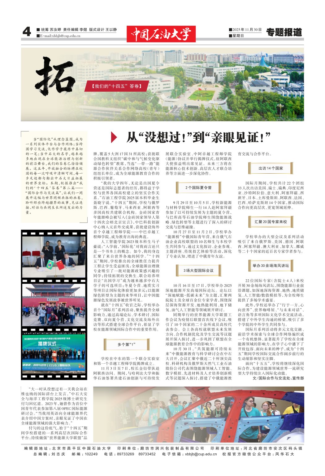 面向“十五五”,学校将继续深化国际合作,为建设能源领域世界一流研究型大学持续注入国际化动能。