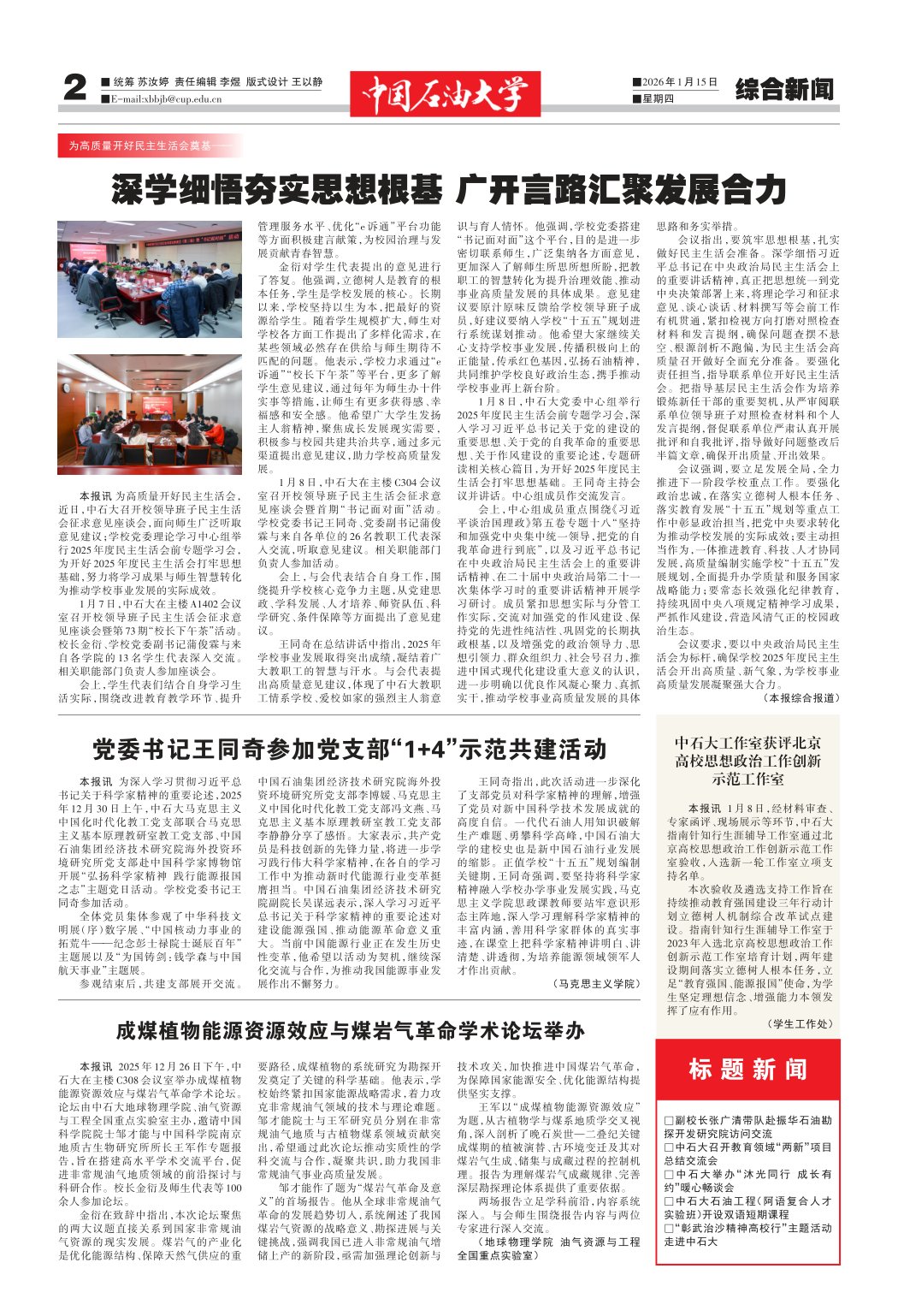 本报讯 2025 年 12 月 26 日下午,中石大在主楼 C308 会议室举办成煤植物能源资源效应与煤岩气革命学术论坛。论坛由中石大地球物理学院、油气资源与工程全国重点实验室主办,邀请中国科学院院士邹才能与中国科学院南京地质古生物研究所所长王军作专题报告,旨在搭建高水平学术交流平台,促进非常规油气地质领域的前沿探讨与科研合作。校长金衍及师生代表等 100余人参加论坛。