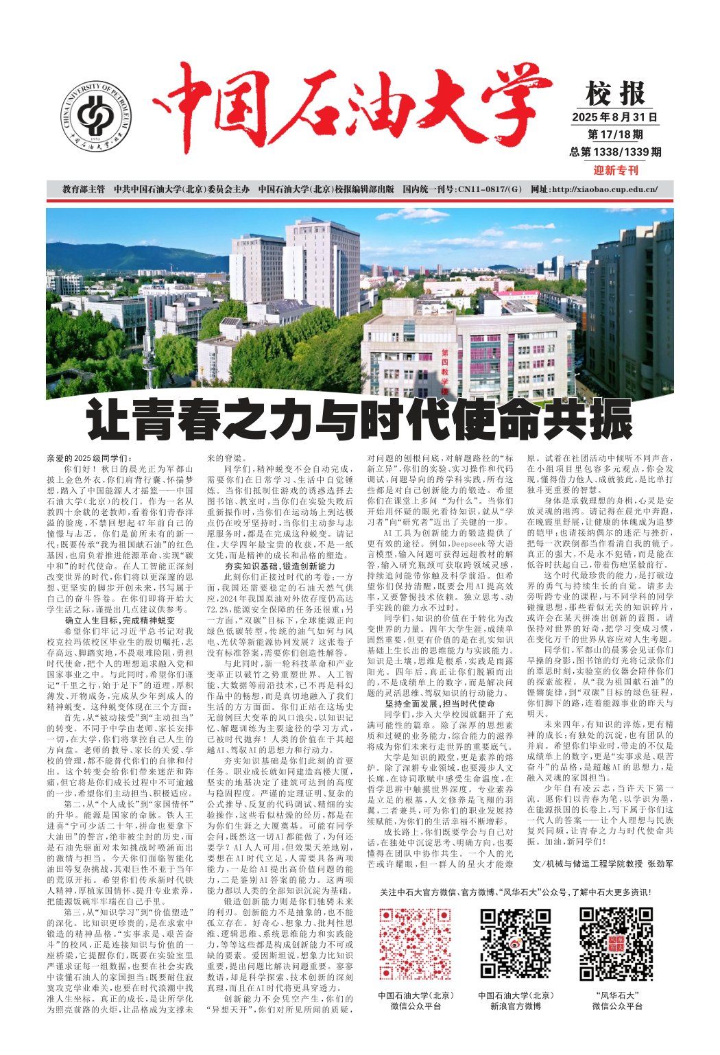 亲爱的2025级同学们:你们好!秋日的晨光正为军都山披上金色外衣,你们肩背行囊、怀揣梦想,踏入了中国能源人才摇篮——中国石油大学(北京)的校门。作为一名从教四十余载的老教师,看着你们青春洋溢的脸庞,不