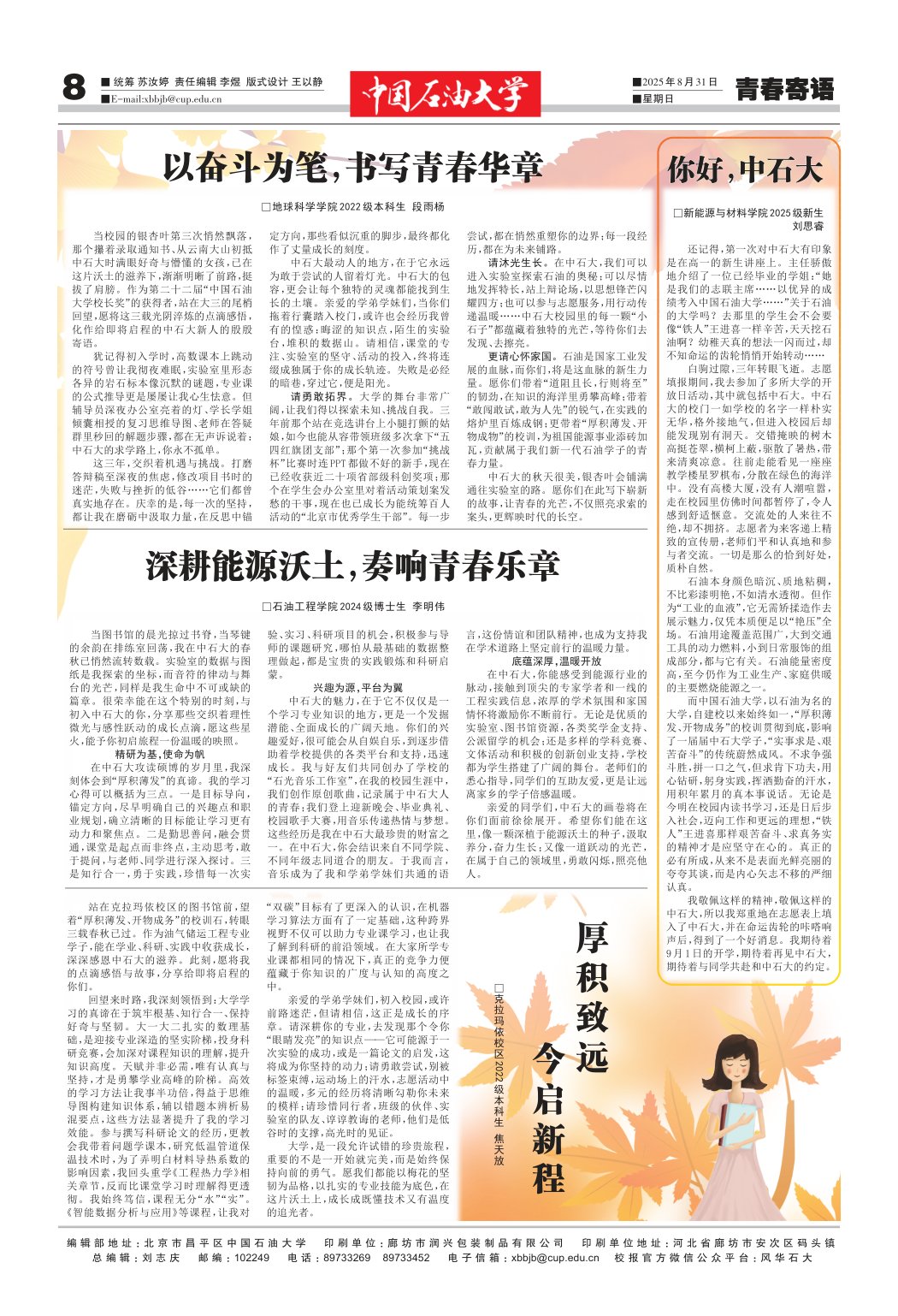 当图书馆的晨光掠过书脊,当琴键的余韵在排练室回荡,我在中石大的春秋已悄然流转数载。实验室的数据与图纸是我探索的坐标,而音符的律动与舞台的光芒,同样是我生命中不可或缺的篇章。很荣幸能在这个特别的时刻,与
